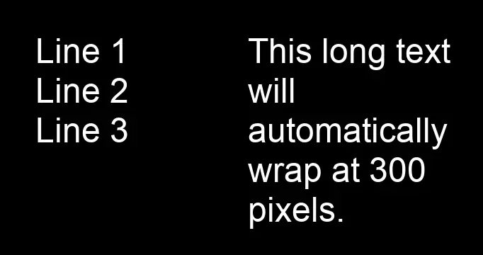 dialogue.text = "This long text will automatically wrap at 300 pixels."